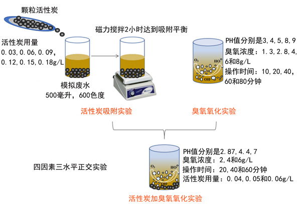 根據以前的單個活性炭吸附和臭氧化實驗的結果,設計了四個因素和三個水平的正交實驗,討論模擬廢水的色度和COD cr去除效果并確定最佳實驗參數。具有操作條件的實驗程序設計流程圖如圖2所示。