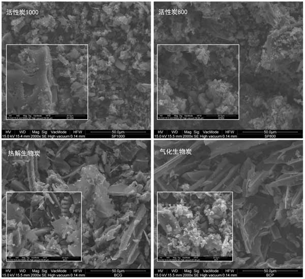 圖2:研究的1000碘值活性炭,800碘值活性炭,熱解生物炭和氣化生物炭樣品的SEM圖像。子圖是較高放大倍數的SEM圖像。