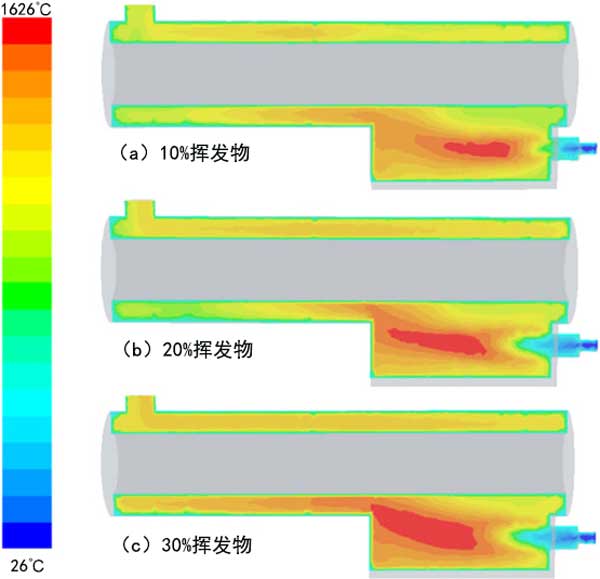 圖3:旋轉反應器橫截面上的溫度分布:(a)用于燃燒的碳化揮發物的10%;(b)用于燃燒的碳化揮發物的20%;(c)30%用于燃燒的碳化揮發物。